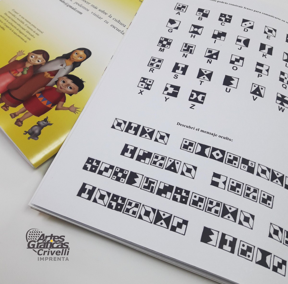Historia y juegos en papel obra a una sola tinta combinados con una central en papel autoadhesivo impresa a todo color.