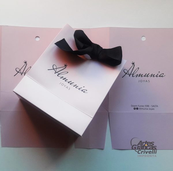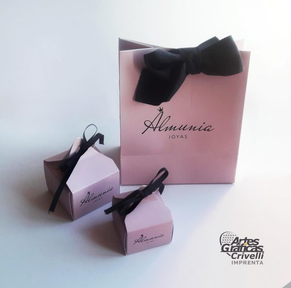 Para inspirarte te mostramos un set de cajas de distintos tamaños y bolsas para joyería que salieron de nuestros talleres, además se imprimieron stickers y diferentes complementos gráficos.